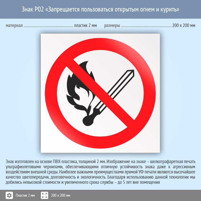 Знак P02 «Запрещается пользоваться открытым огнем и курить» (пластик, 200х200 мм) в Рыбинске купить