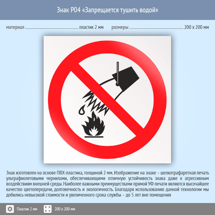 Знак P04 «Запрещается тушить водой» (пластик, 200х200 мм) в Рыбинске купить