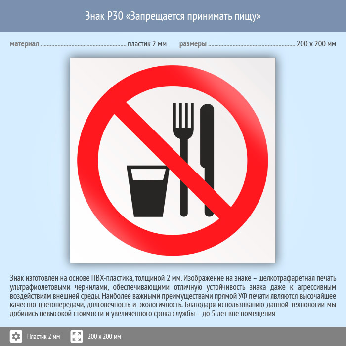 Знак P30 «Запрещается принимать пищу» (пластик, 200х200 мм) в Рыбинске купить