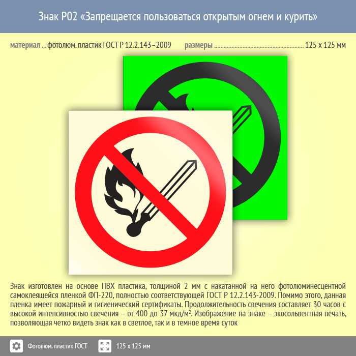 Знак P02 «Запрещается пользоваться открытым огнем и курить» (фотолюминесцентный пластик ГОСТ 34428-2018, 125х125 мм) в Рыбинске купить