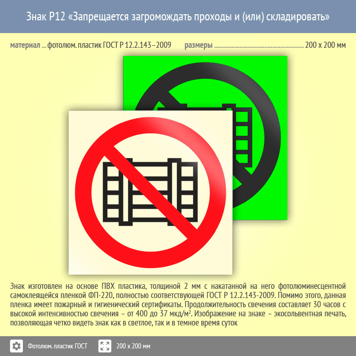Знак P12 «Запрещается загромождать проходы и (или) складировать» (фотолюминесцентный пластик ГОСТ 34428-2018, 200х200 мм) в Рыбинске купить