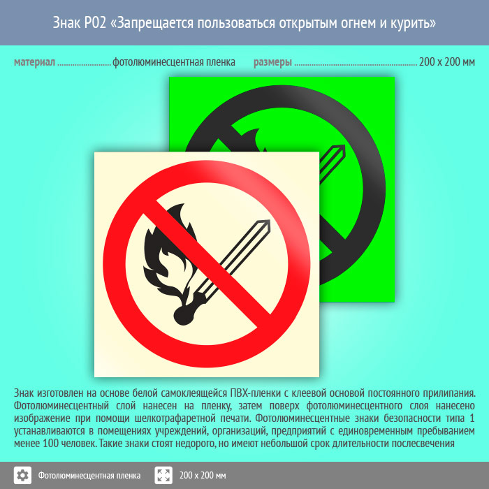 Знак P02 «Запрещается пользоваться открытым огнем и курить» (фотолюминесцентная пленка, 200х200 мм) в Рыбинске купить