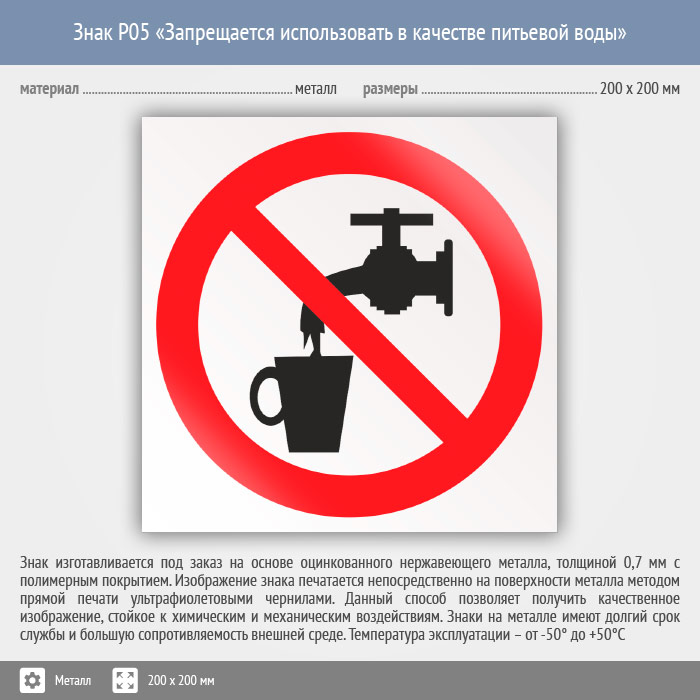 Знак P05 «Запрещается использовать в качестве питьевой воды» (металл, 200х200 мм) в Рыбинске купить