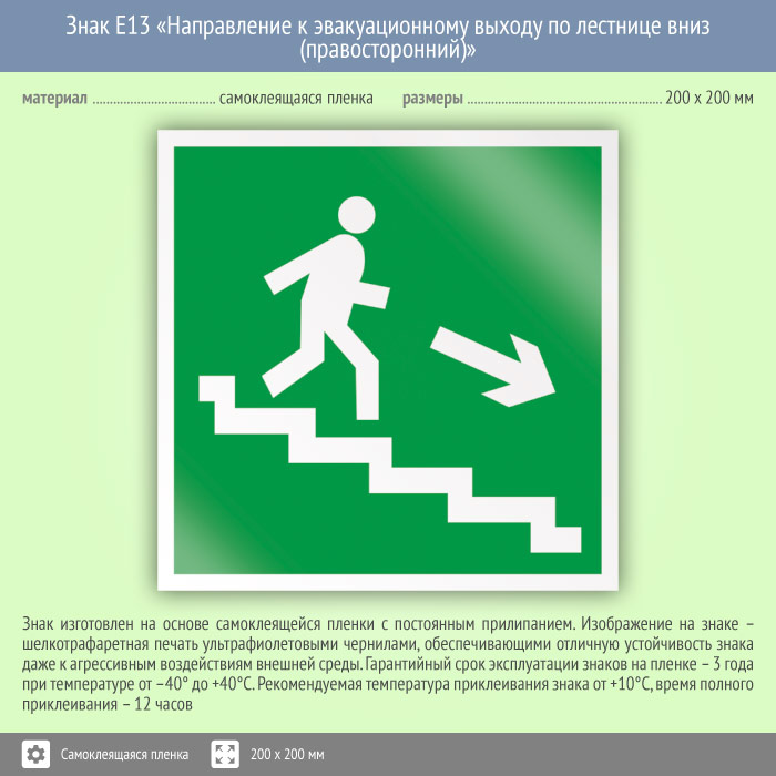 Знак E13 «Направление к эвакуационному выходу по лестнице вниз (правосторонний)» (фотолюм. пленка, 200х200 мм)