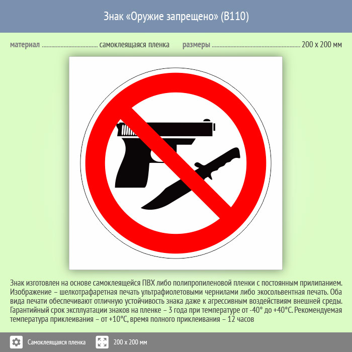 Знак (табличка) «Оружие запрещено» имеет размер(ы): 200х200 мм, но может быть изготовлен(а) любого размера на самоклеящейся пленке, пластике толщиной 0.5, 2 или 4 мм и металле. Также возможно применение фотолюминесцентных и световозвращающих материалов
