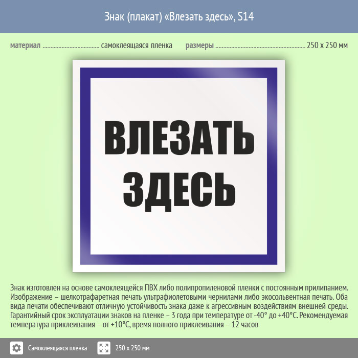 Знак (плакат) «Влезать здесь», S14 (пленка, 250х250 мм)