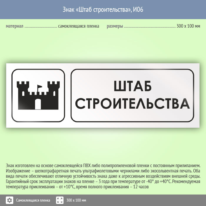 Знак «Штаб строительства» может быть изготовлен любого размера на самоклеящейся пленке, пластике толщиной 0.5, 2 или 4 мм и металле. Также возможно применение фотолюминесцентных и световозвращающих материалов