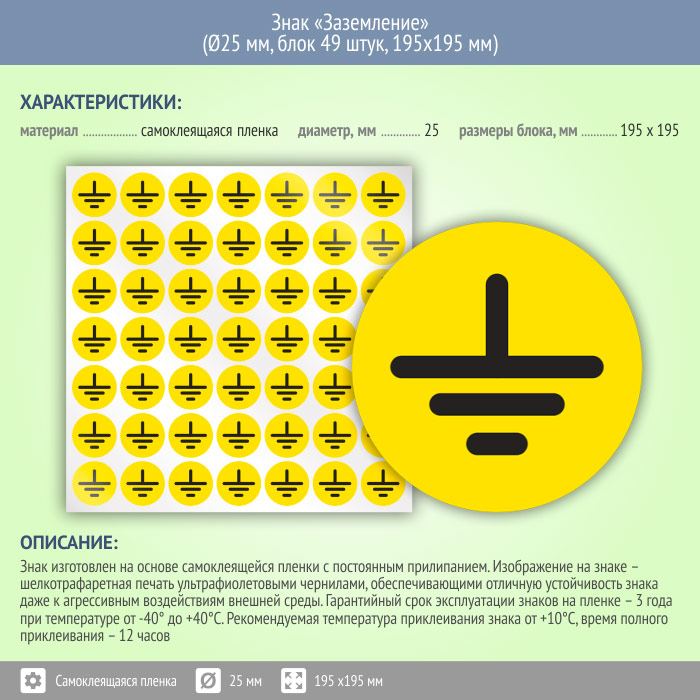Знак (плакат) «Заземление», S46 (пленка, диаметр 25 мм, блок 49 штук, 195х195 мм) в Рыбинске купить