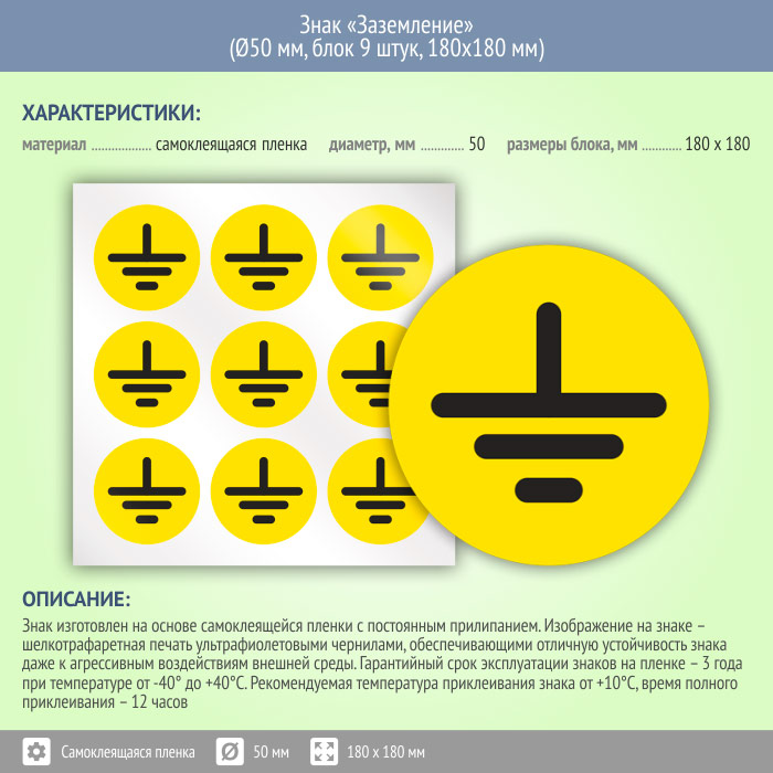 Знак (плакат) «Заземление», S46 (пленка, диаметр 50 мм, блок 9 штук, 180х180 мм) в Рыбинске купить