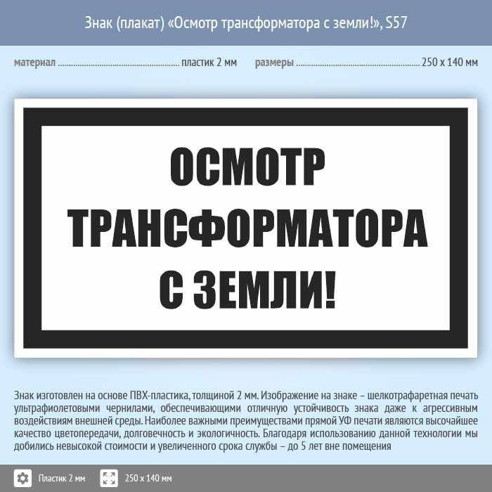 Знак (плакат) «Осмотр трансформатора с земли!», S57 (пластик, 250х140 мм) в Рыбинске купить