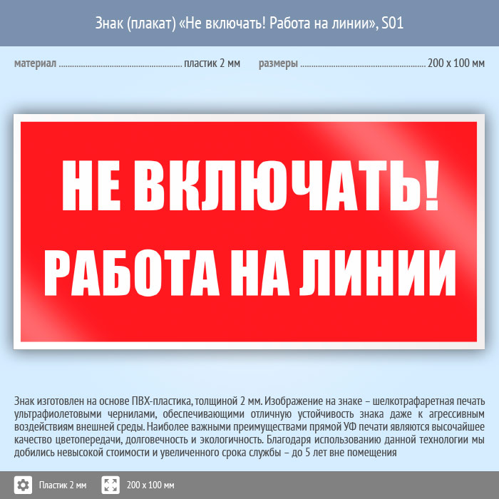 Знак (плакат) «Не включать! Работа на линии», S01 (пластик, 200х100 мм) в Рыбинске купить