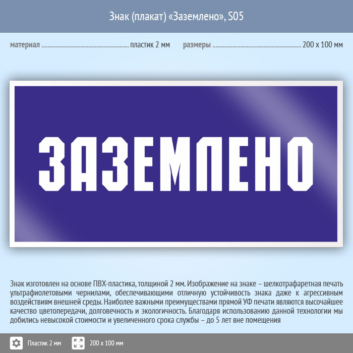 Знак (плакат) «Заземлено», S05 (пластик, 200х100 мм) в Рыбинске купить