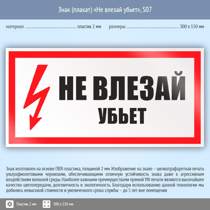Знак (плакат) «Не влезай убьет», S07 (пластик, 300х150 мм) в Рыбинске купить