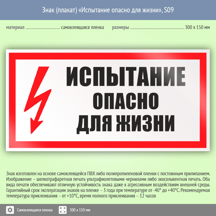 Знак (плакат) «Испытание опасно для жизни», S09 (пленка, 300х150 мм) в Рыбинске купить
