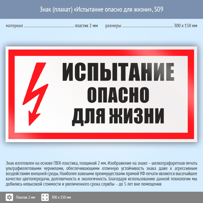 Знак (плакат) «Испытание опасно для жизни», S09 (пластик, 300х150 мм) в Рыбинске купить
