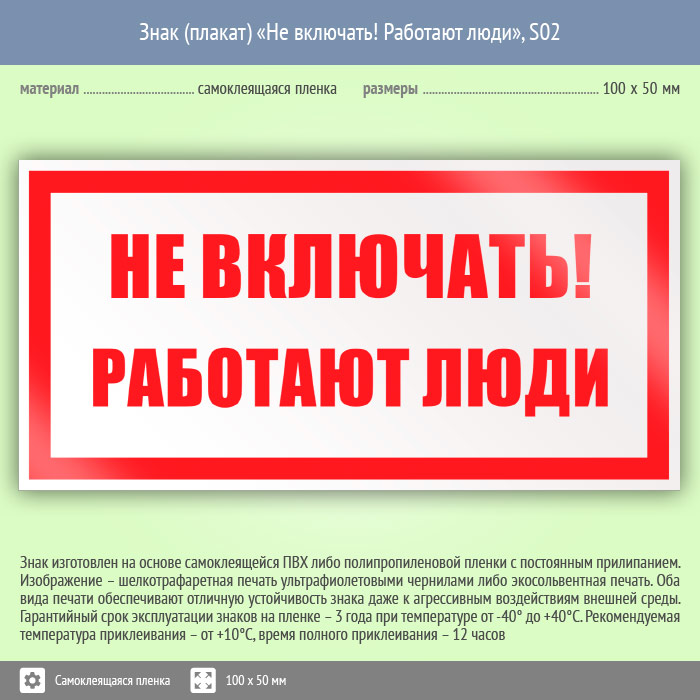 Знак (плакат) «Не включать! Работают люди», S02 (пленка, 100х50 мм) в Рыбинске купить