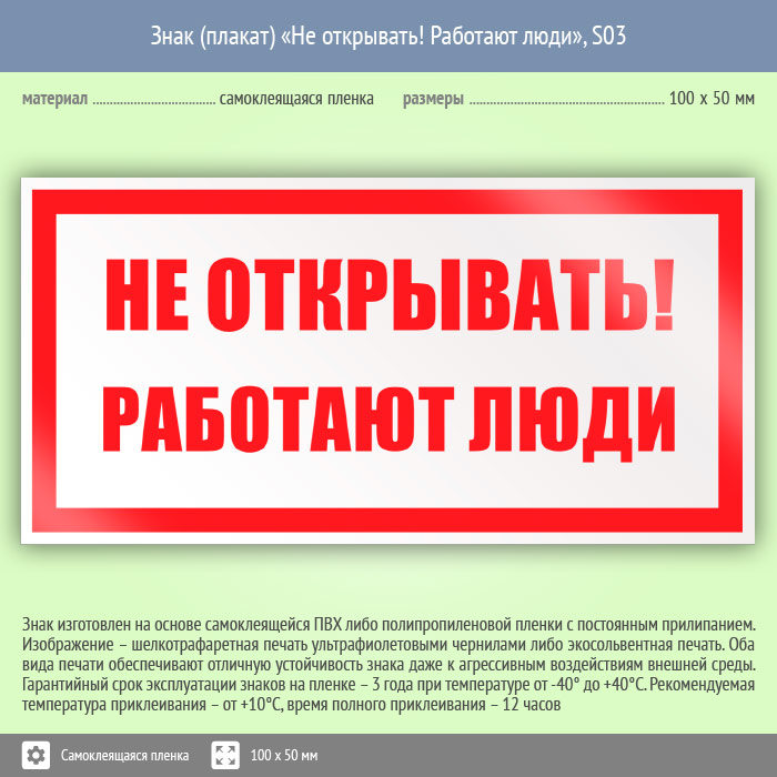 Знак (плакат) «Не открывать! Работают люди», S03 (пленка, 100х50 мм) в Рыбинске купить