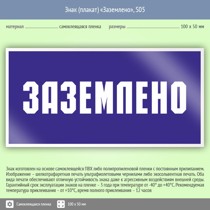 Знак (плакат) «Заземлено», S05 (пленка, 100х50 мм) в Рыбинске купить