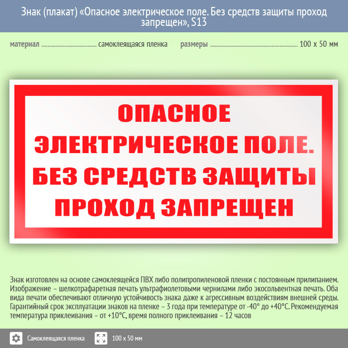 Знак (плакат) «Опасное электрическое поле. Без средств защиты проход запрещен», S13 (пленка, 100х50 мм) в Рыбинске купить