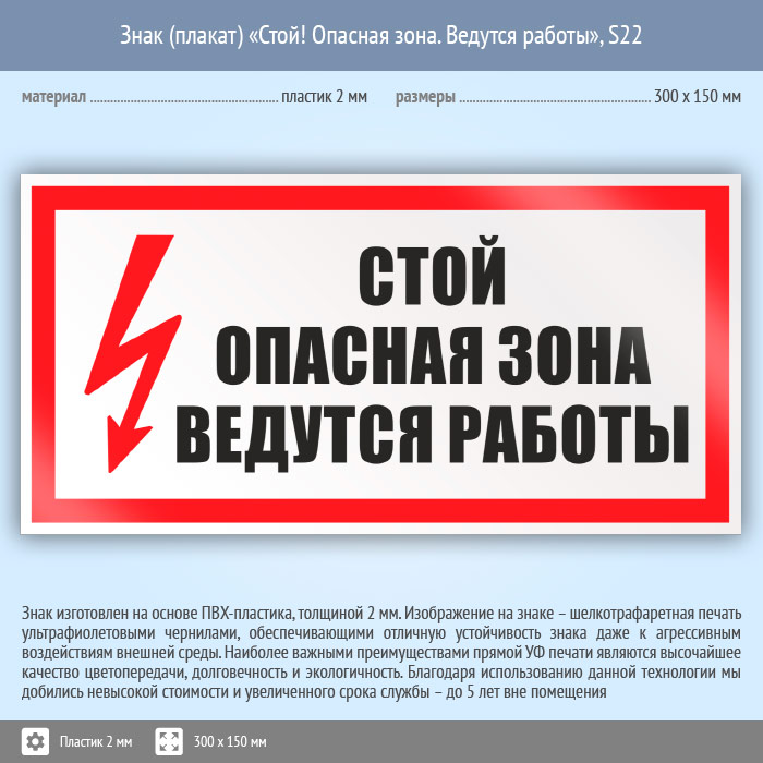 Знак (плакат) «Стой! Опасная зона. Ведутся работы», S22 (пластик, 300х150 мм) в Рыбинске купить
