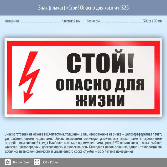Знак (плакат) «Стой! Опасно для жизни», S25 (пластик, 300х150 мм) в Рыбинске купить