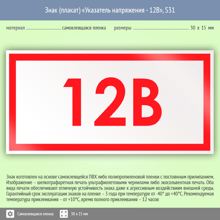 Знак (плакат) «Указатель напряжения 12 В», S31 (50 штук, пленка, 30х15 мм) в Рыбинске купить