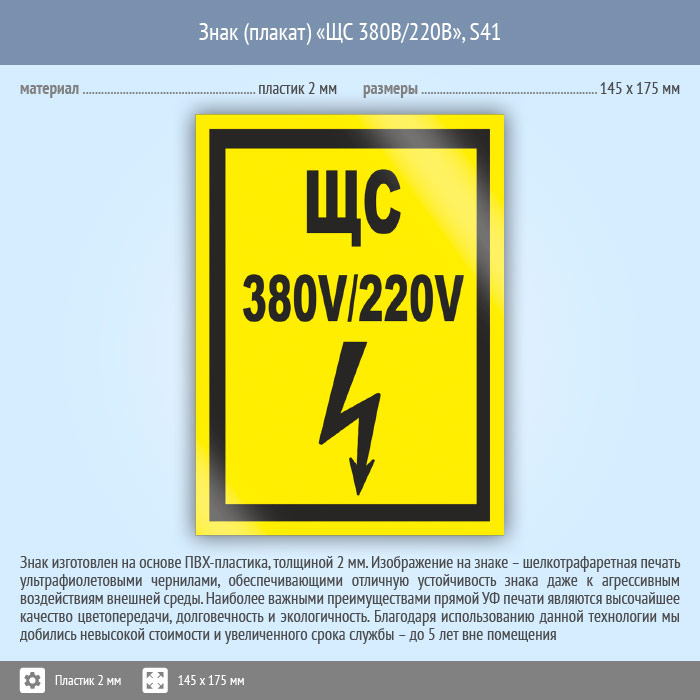 Знак (плакат) «ЩС 380В/220В», S41 (пластик, 145х175 мм) в Рыбинске купить
