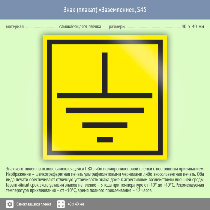 Знак (плакат) «Заземление», S45 (25 штук пленка, 40х40 мм) в Рыбинске купить