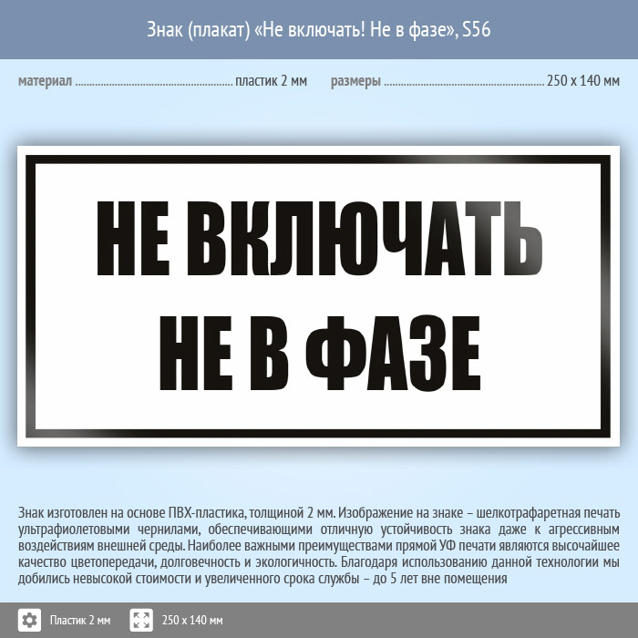 Знак (плакат) «Не включать! Не в фазе», S56 (пластик, 250х140 мм) в Рыбинске купить