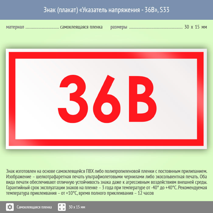Знак (плакат) «Указатель напряжения - 36В», S33 (50 штук, пленка, 30х15 мм) в Рыбинске купить