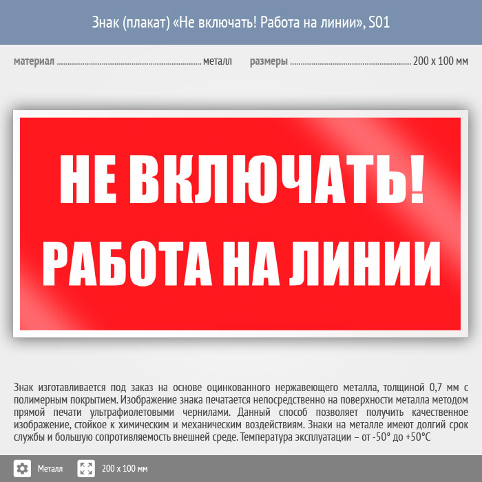 Знак (плакат) «Не включать! Работа на линии», S01 (металл, 200х100 мм) в Рыбинске купить