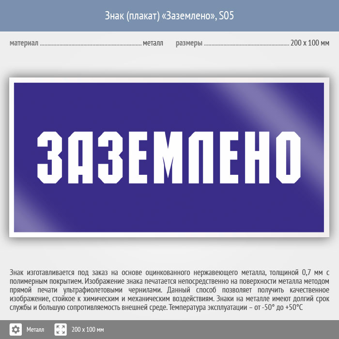 Знак (плакат) «Заземлено», S05 (металл, 200х100 мм) в Рыбинске купить