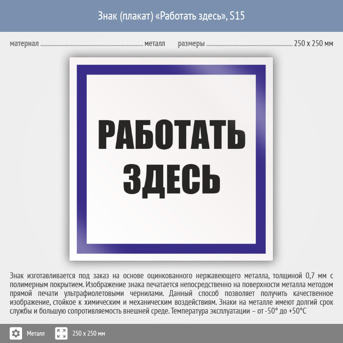 Знак (плакат) «Работать здесь», S15 (металл, 250х250 мм) в Рыбинске купить