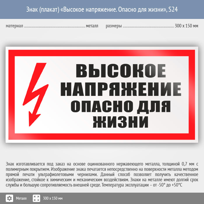 Знак (плакат) «Высокое напряжение. Опасно для жизни», S24 (металл, 300х150 мм) в Рыбинске купить