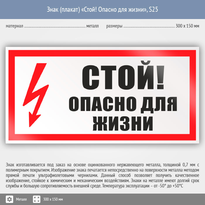 Знак (плакат) «Стой! Опасно для жизни», S25 (металл, 300х150 мм) в Рыбинске купить