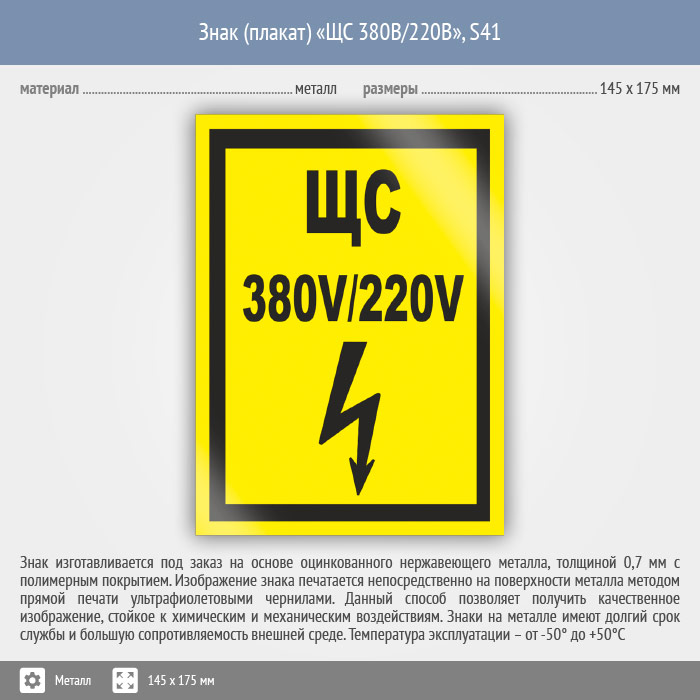 Знак (плакат) «ЩС 380В/220В», S41 (металл, 145х175 мм) в Рыбинске купить