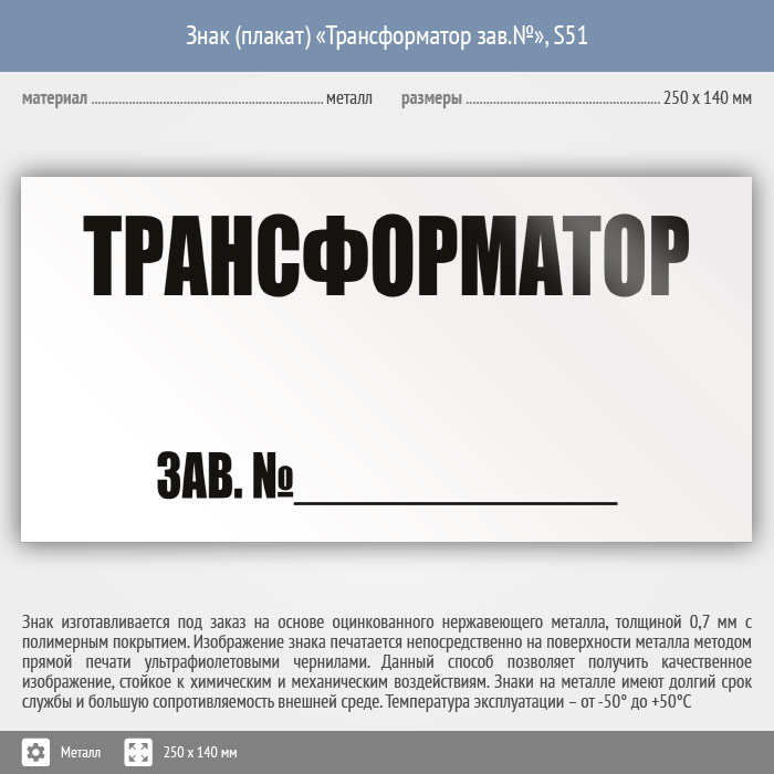 Знак (плакат) «Трансформатор зав.№», S51 (металл, 250х140 мм) в Рыбинске купить