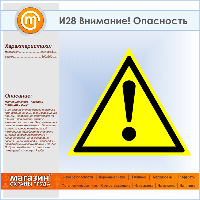 Знак «Внимание! Опасность», И28 (пластик, сторона 300 мм) в Рыбинске купить