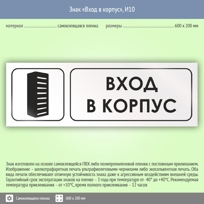 Знак «Вход в корпус», И10 (пленка, 600х200 мм) в Рыбинске купить