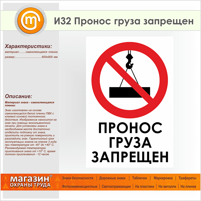 Знак «Пронос груза запрещен», И32 (пленка, 600х900 мм) в Рыбинске купить