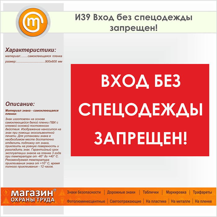 Знак «Вход без спецодежды запрещен!», И39 (пленка, 900х600 мм) в Рыбинске купить