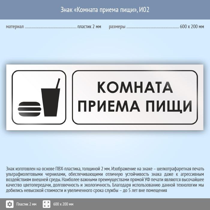 Знак «Комната приема пищи», И02 (пластик, 600х200 мм) в Рыбинске купить