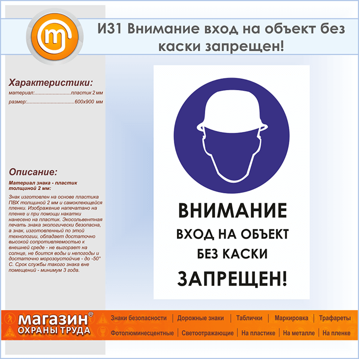 Знак «Внимание вход на объект без каски запрещен!», И31 (пластик, 600х900 мм) в Рыбинске купить
