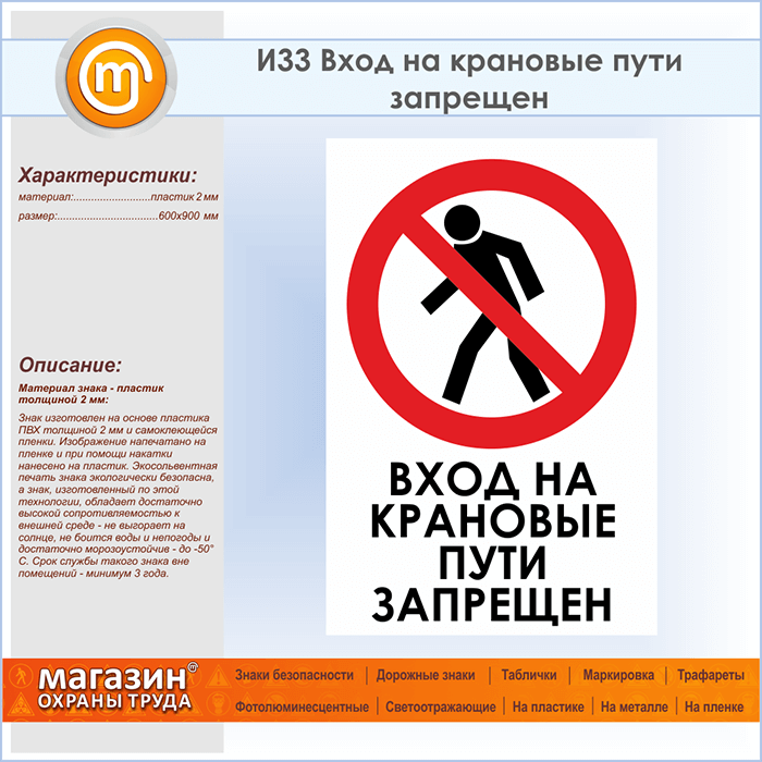 Знак «Вход на крановые пути запрещен», И33 (пластик, 600х900 мм) в Рыбинске купить