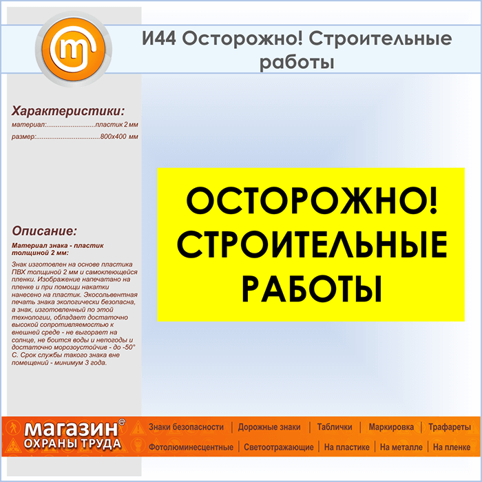 Знак «Осторожно! Строительные работы», И44 (пластик, 800х400 мм) в Рыбинске купить
