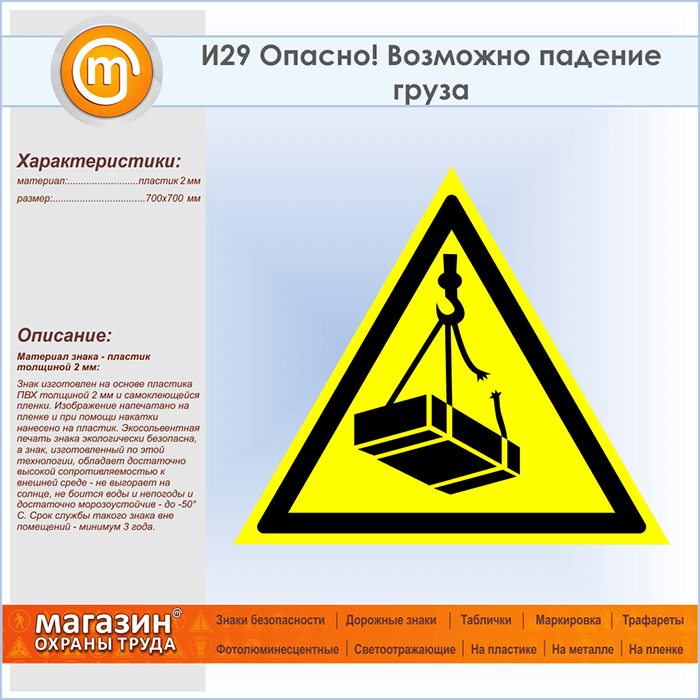 Знак «Опасно! Возможно падение груза», И29 (пластик, сторона 700 мм) в Рыбинске купить