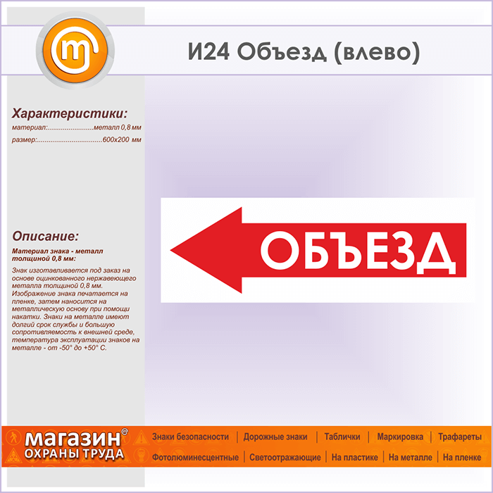 Знак «Объезд (влево)», И24 (металл, 600х200 мм) в Рыбинске купить