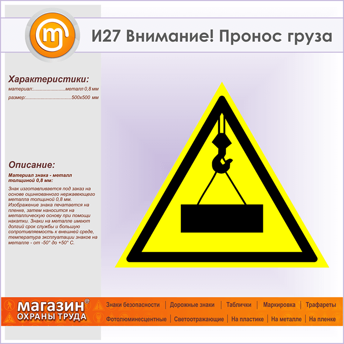 Знак «Внимание! Пронос груза», И27 (металл, сторона 500 мм) в Рыбинске купить