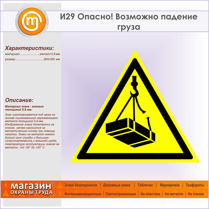 Знак «Опасно! Возможно падение груза», И29 (металл, сторона 300 мм) в Рыбинске купить