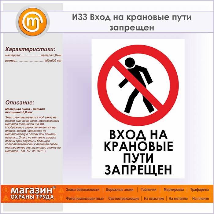 Знак «Вход на крановые пути запрещен», И33 (металл, 400х600 мм) в Рыбинске купить